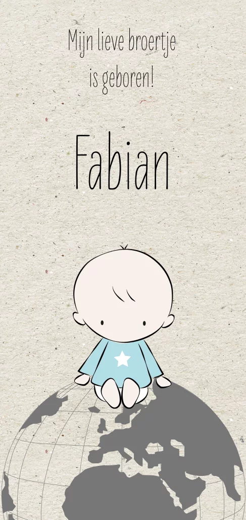 Langwerpige staande kaart met schattig jochie zittend op de wereldbol met structuur papier achtergrond.