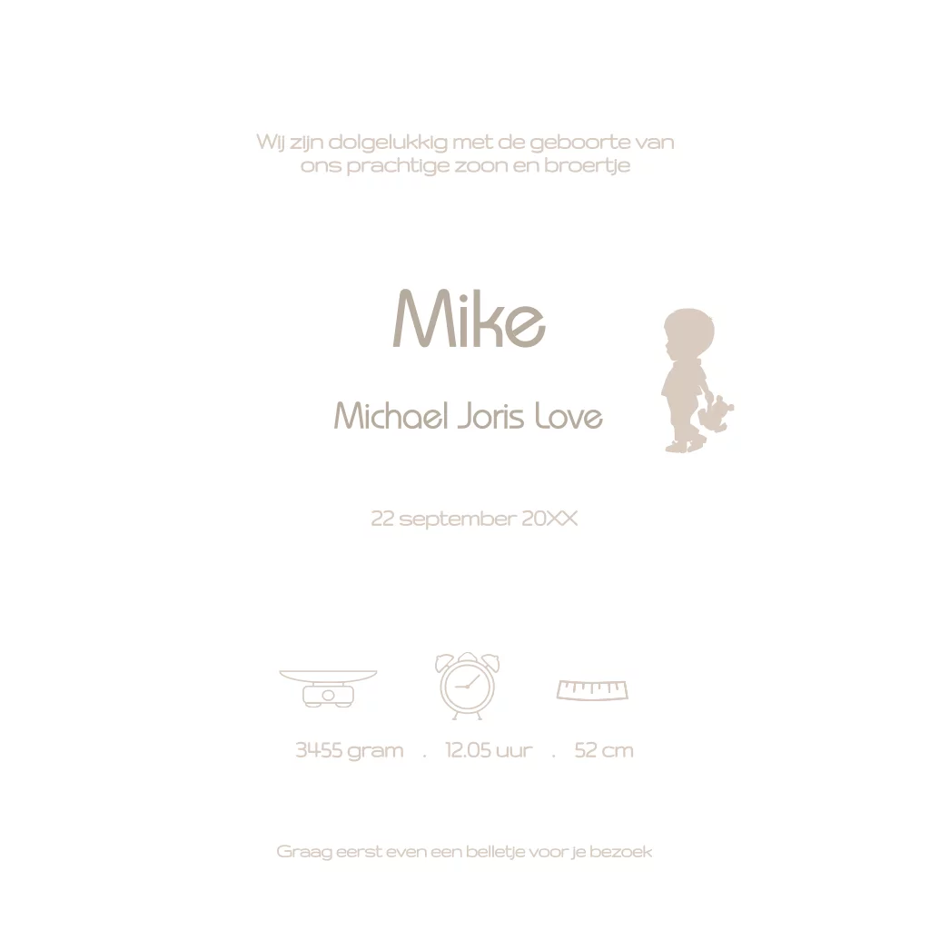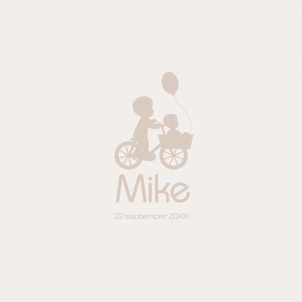 Hippe geboortekaart voor jongetje met lieve silhouet illustratie van jongen met zijn kleine broertje op de fiets en treintje.