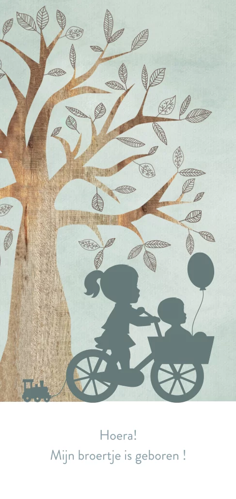 Staande kaart met een boom met blaadjes en een silhouet van broertjes samen op de fiets van JilleJille.