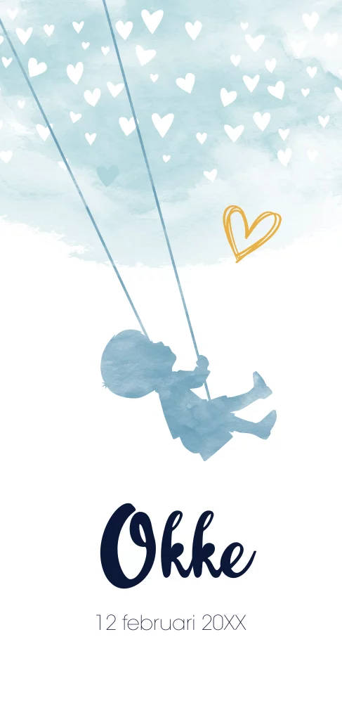 Langwerpige enkele staande kaart met confetti van hartjes, waterverf en schommelend jongetje. Pas dit silhouet geboortekaartje eenvoudig zelf aan!