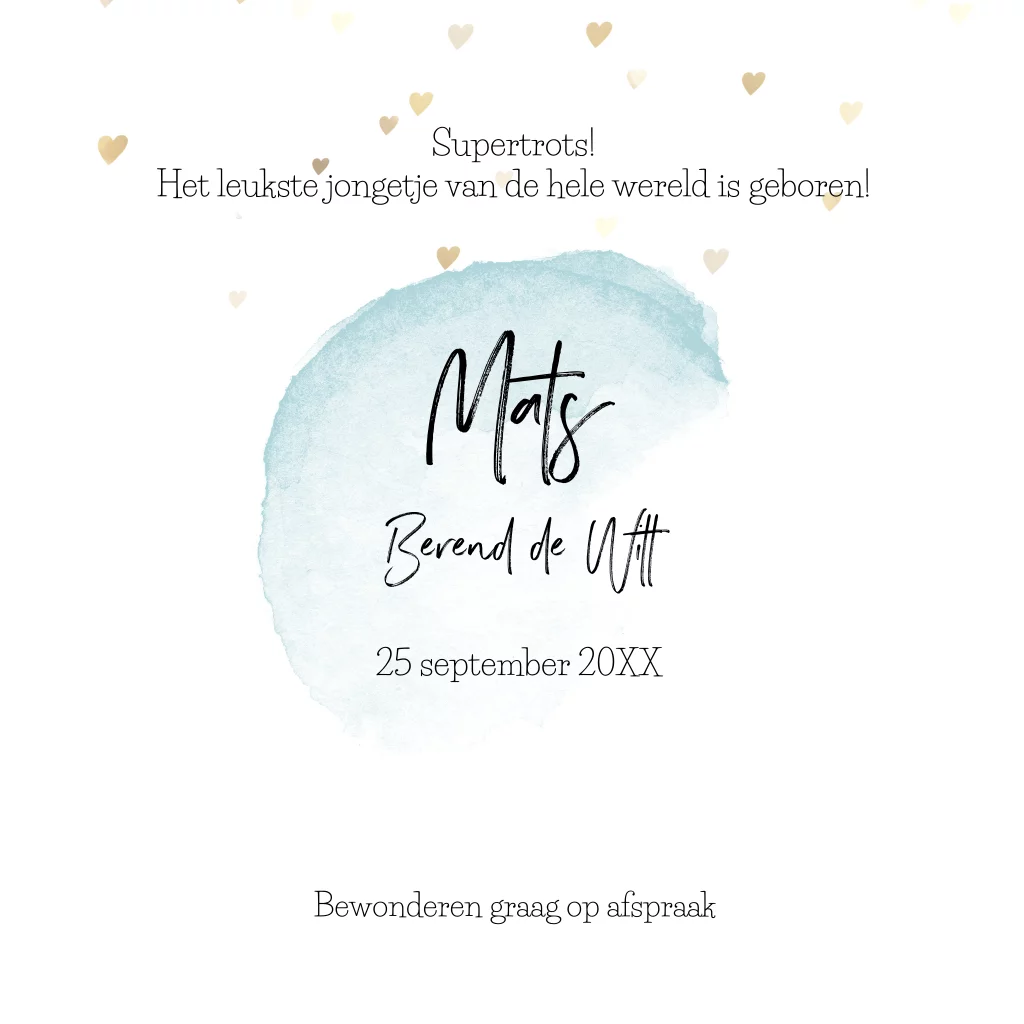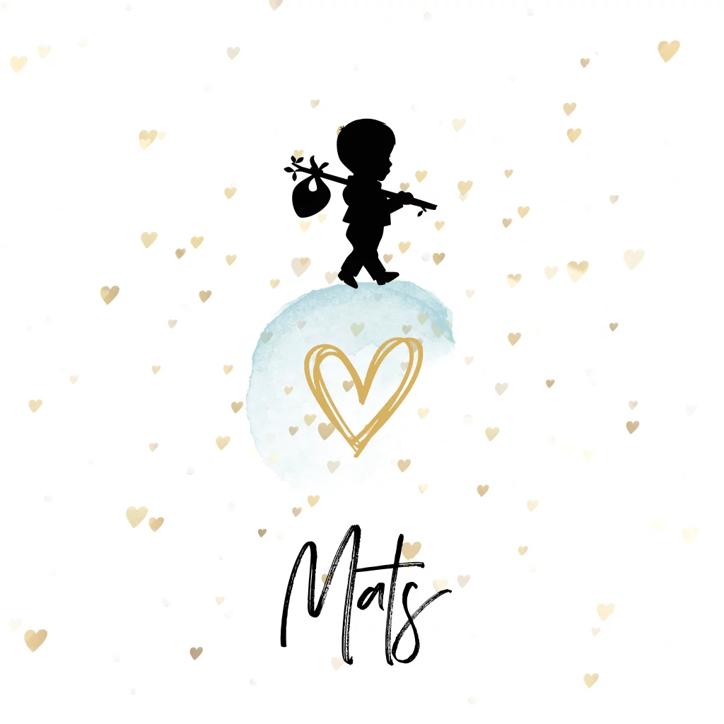 Hip geboortekaartje met goud-kleurige dwarrelende hartjes en waterverf op witte achtergrond en het silhouet van een jongetje met een knapzak.