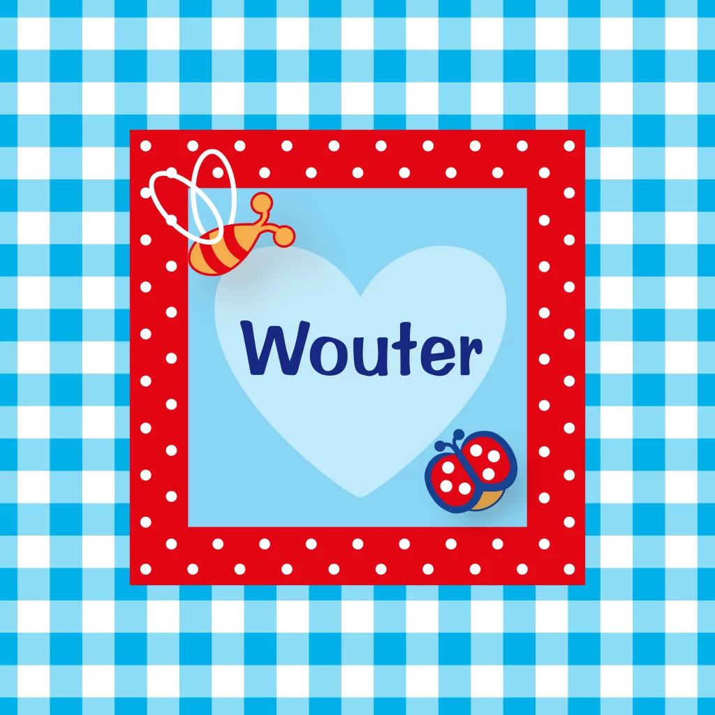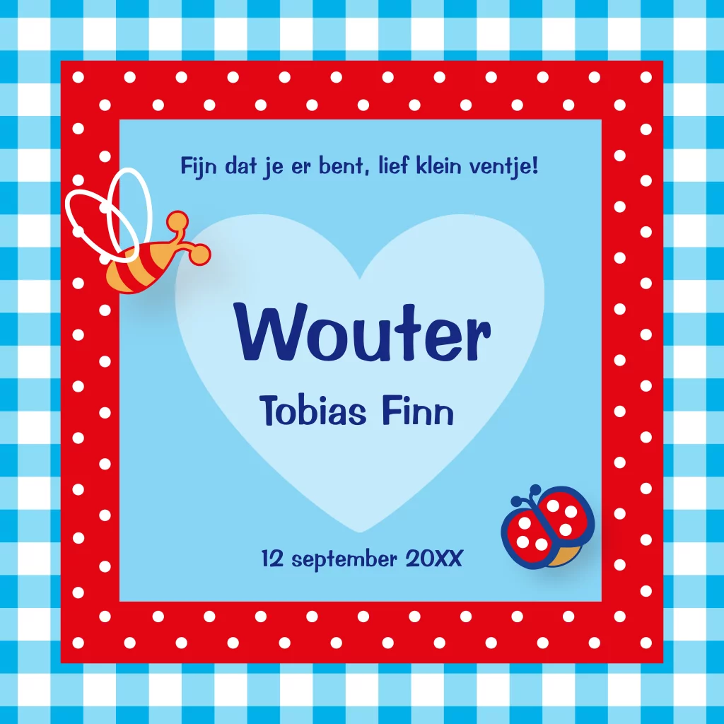 Trendy geboortekaart Wouter met ruitje en leuke sterren en stippen, een schattig bijtje en een lief lieveheersbeestje. Geboortekaartjes met ruitjes en stippen om zelf te maken bij JilleJille. Je kunt zelf ook de kleuren veranderen bij deze kaart voor stoer en hip jongetje.