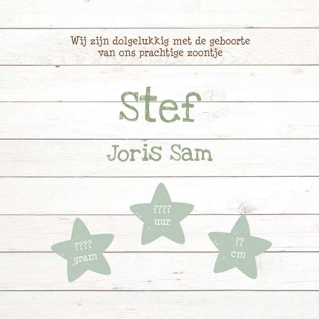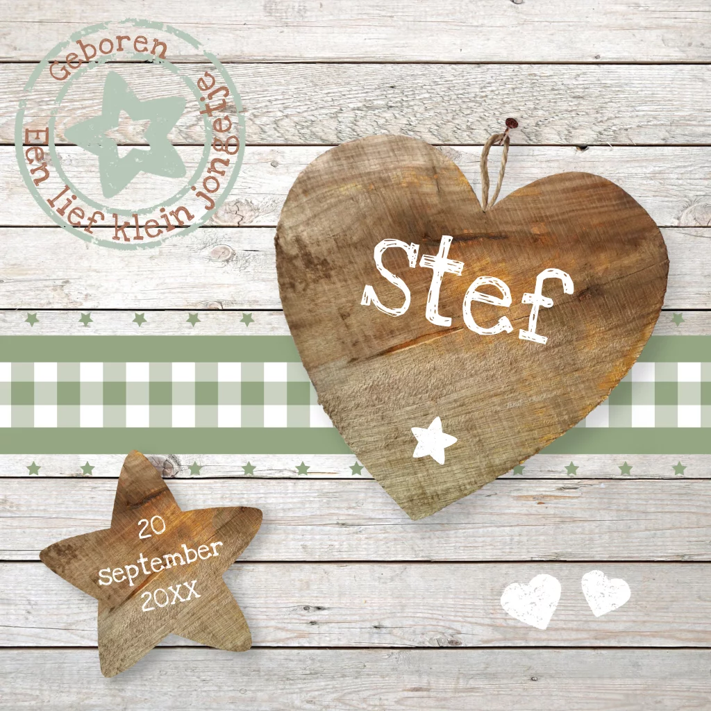 hip houten geboortekaartje voor jongen met stoer steigerhout en hartje