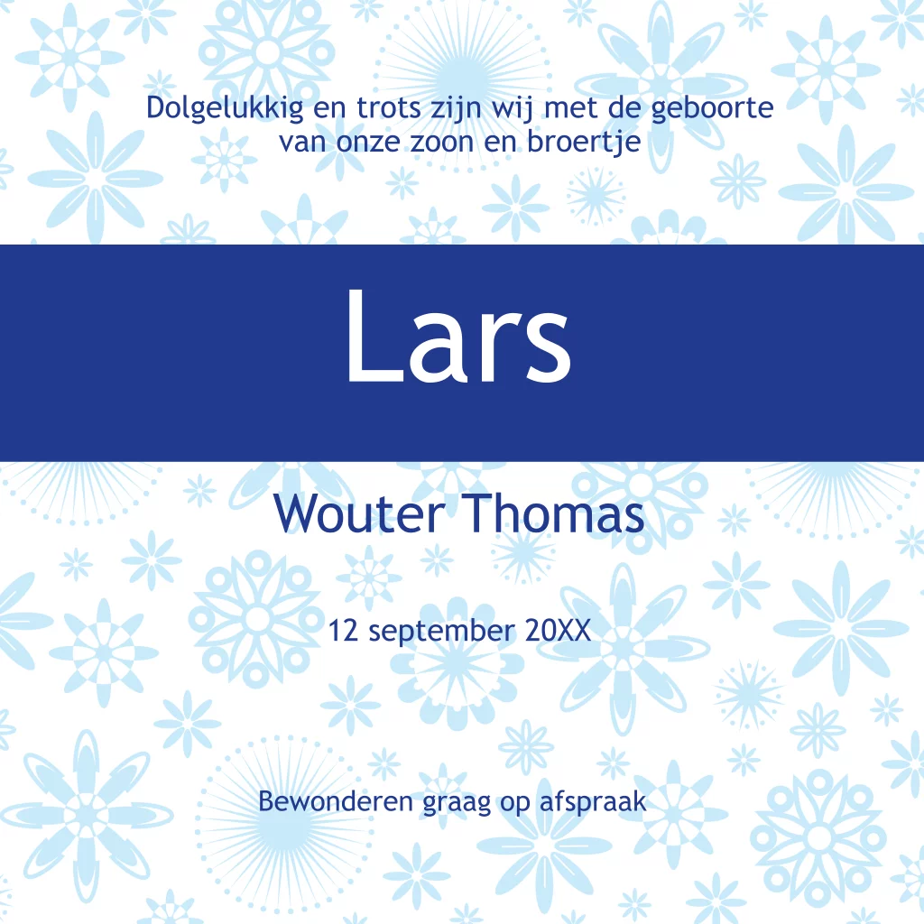 Dit hippe strakke geboortekaartje Lars met leuke sterren en dessins is voor een hippe jongen. Maak eenvoudig je geboortekaartje met leuke sterren in Hollandse kleuren. Een origineel trendy geboortekaartje met mooie stervormen in de Hollandse kleurcombinatie van rood, wit en blauwe tinten.