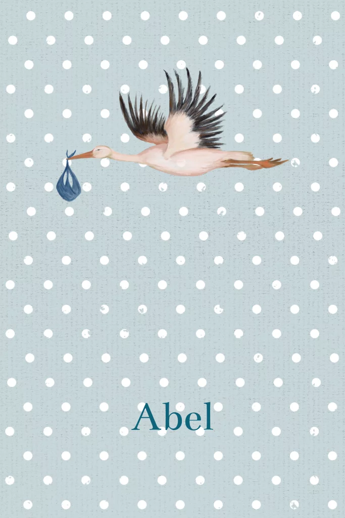 Origineel geboortekaartje met illustatie van een vogeltje / ooievaar op een stippen dessin. Rechthoekige staande kaart met stippen dessin.