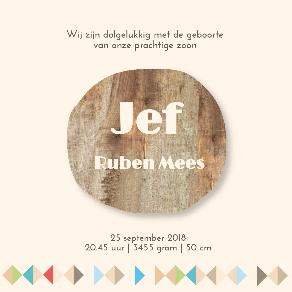 trendy geboortekaart Jef met steigerhout en grafisch dessin