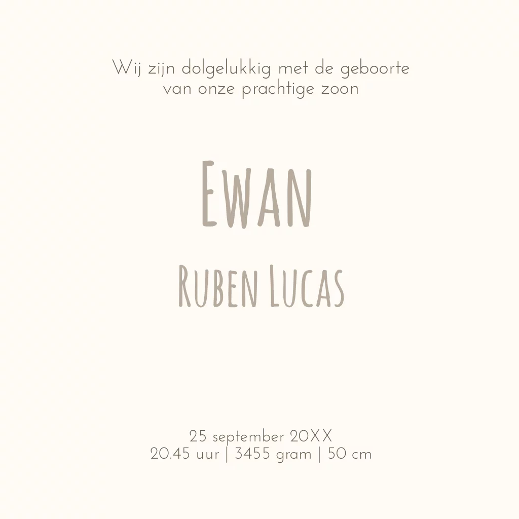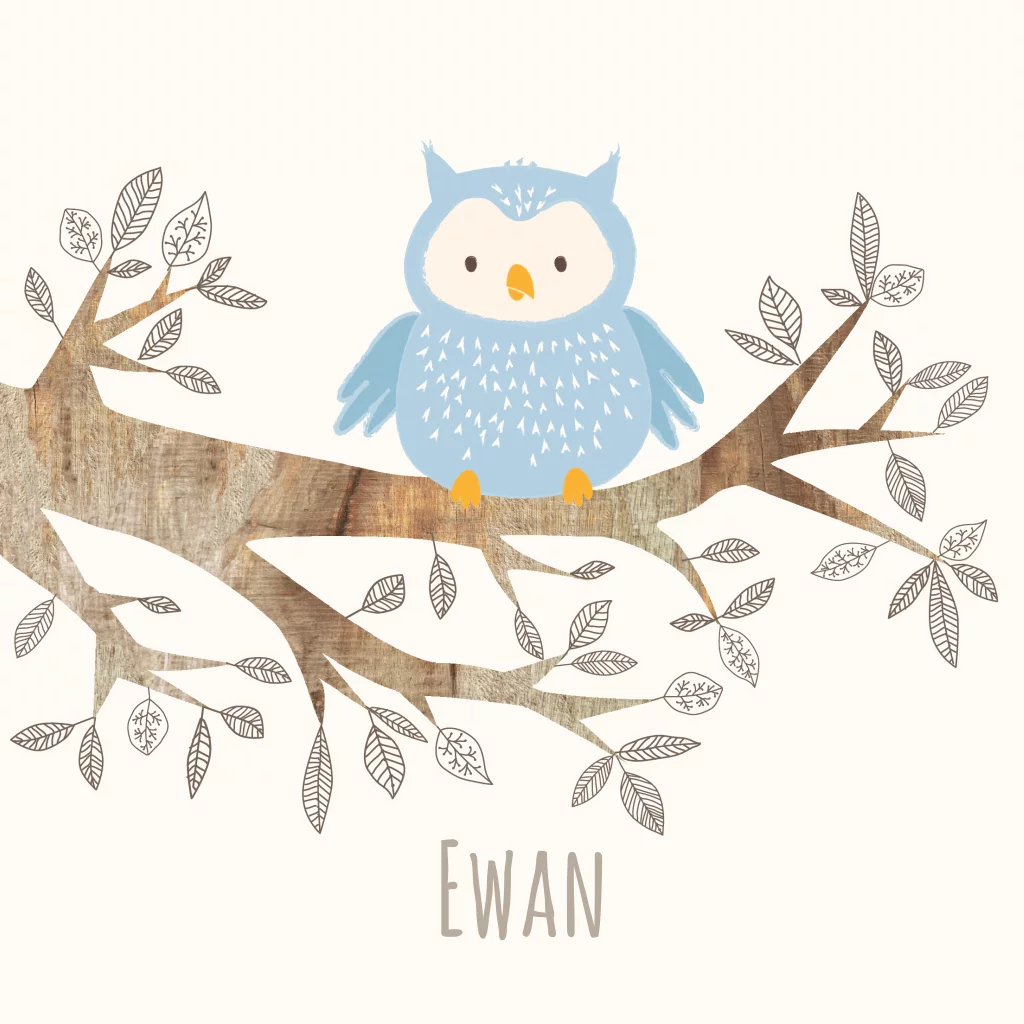 Mooie geboortekaart Ewan met lieve uil hout en takjes voor jongen