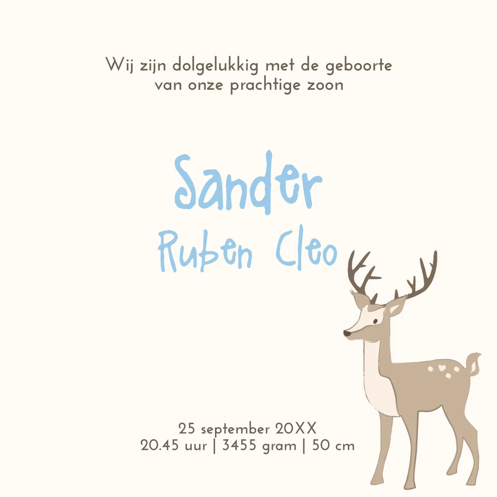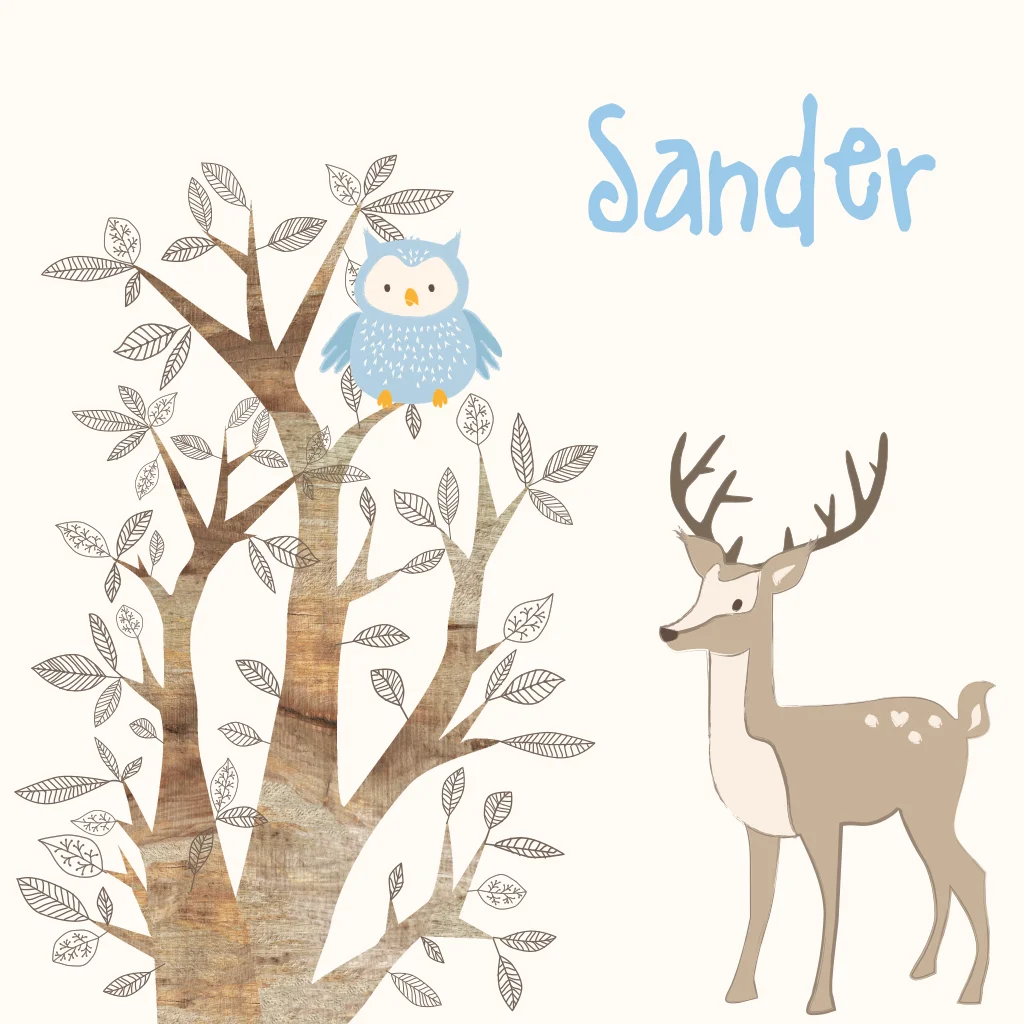 Mooie geboortekaart Sander met lieve uil hout en hertje voor jongen