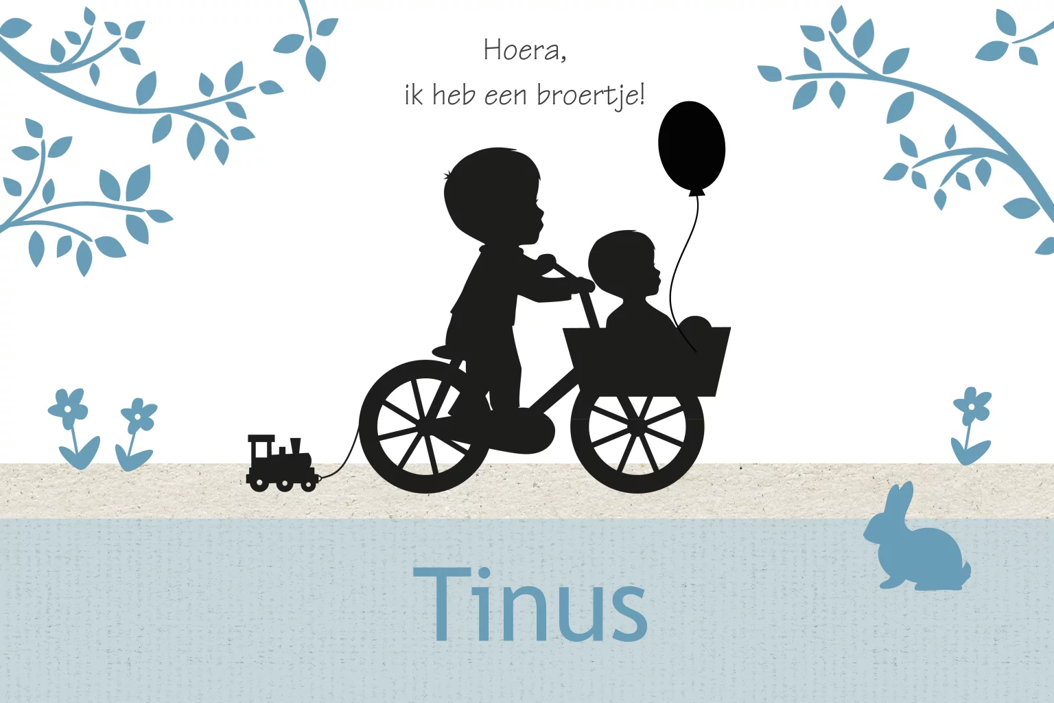 Lief liggend kaartje met silhouetten van twee broertjes op kraftpapier. Jongetje op fiets met bakje waarin een broertje zit.