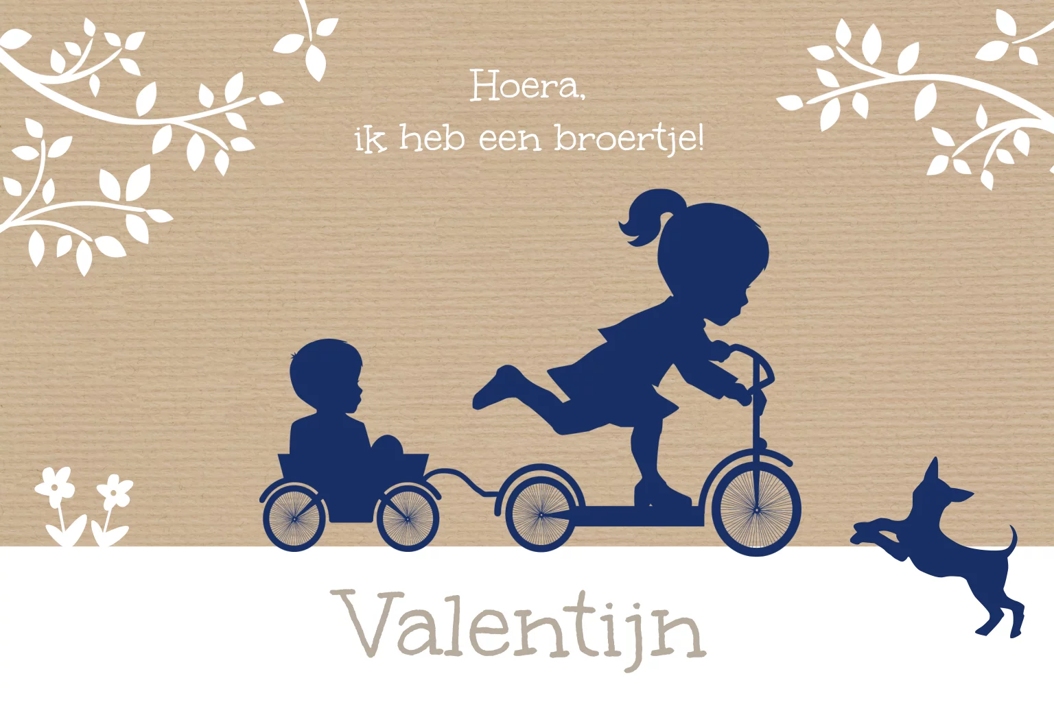 Lief liggend kaartje met silhouetten van 2 kinderen op kraftpapier. Meisje op step met karretje waarin een broertje zit.