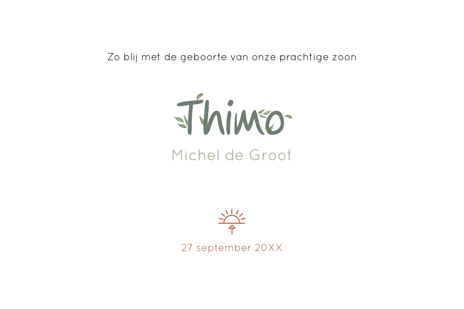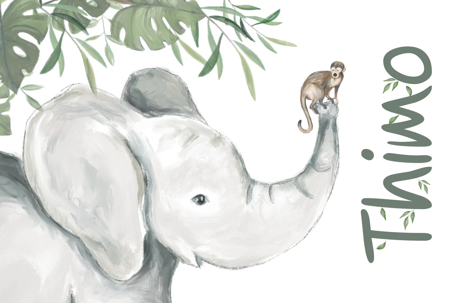 Een hippe jungle geboortekaart met een geschilderde baby olifant, een aapje en bladeren rondom de naam