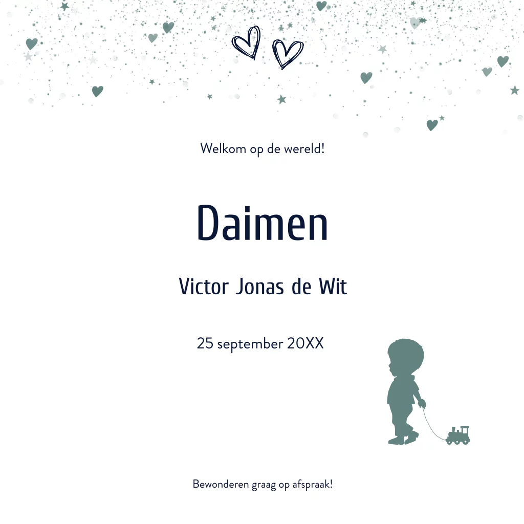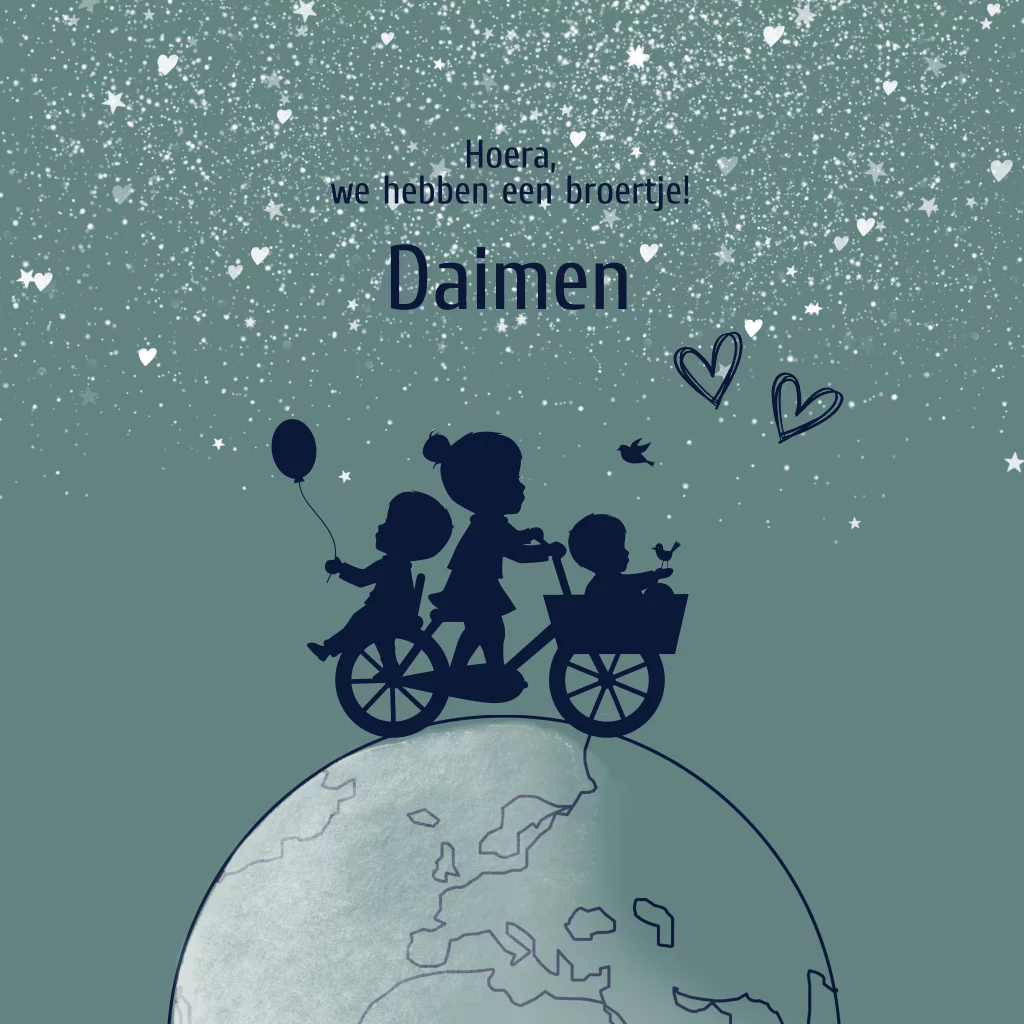 Silhouet geboortekaartje voor jongetje met broertje en zusje op de wereldbol. De afbeeldingen en kleuren zijn eenvoudig aan te passen naar jouw eigen gezinssituatie.