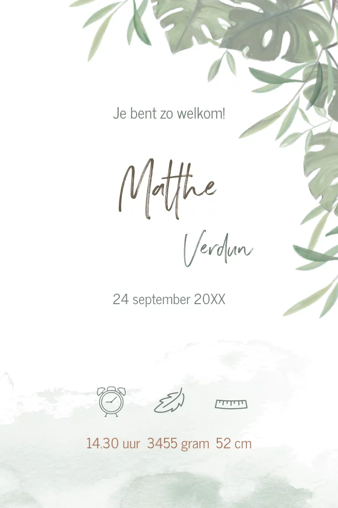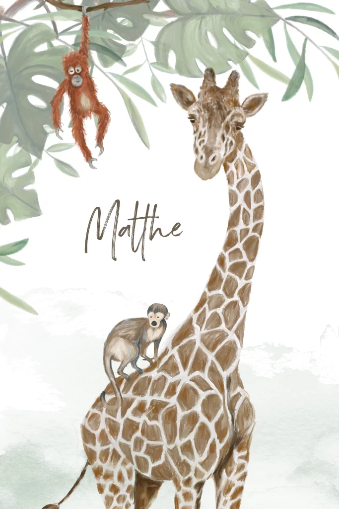 Lieve geboortekaart passend bij een kinderkamer met jungle thema. Deze stoere dubbele kaart met giraf en aapjes kun je eenvoudig zelf personaliseren.