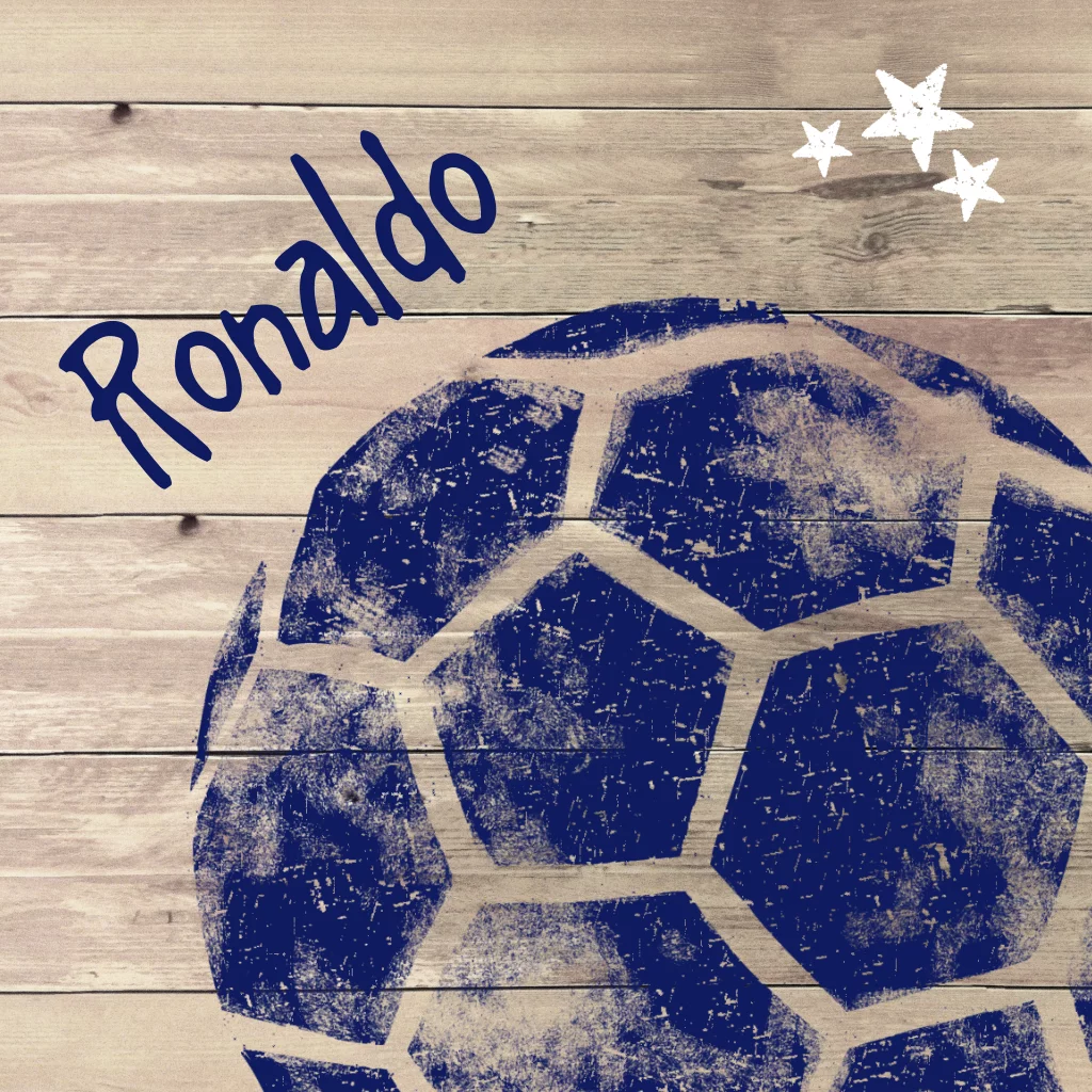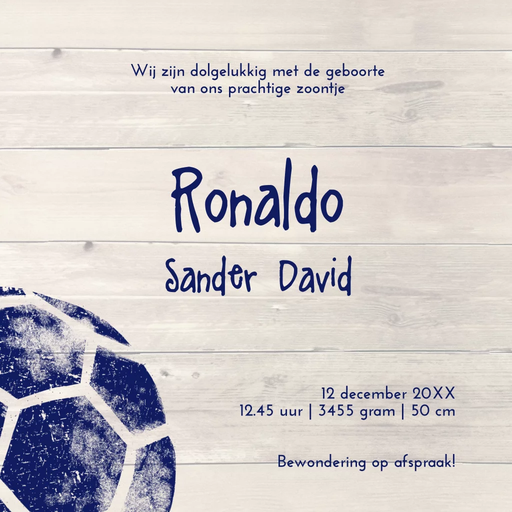 Trendy geboortekaartje Ronaldo met stempel van voetbal op steigerhout. Sloophout met de leuke voetbal stempel en sterretjes maken dit kaartje helemaal af. Originele geboortekaartjes zelf maken bij JilleJille.nl