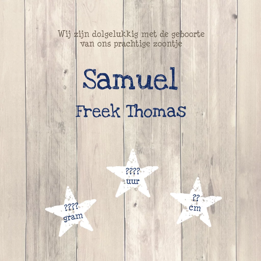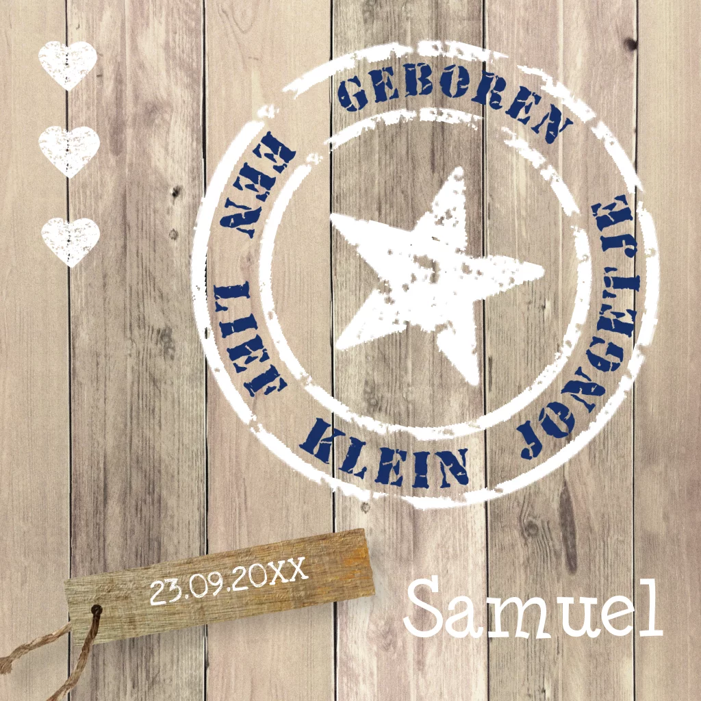 Mooi en stoer geboortekaartje Samuel met steigerhout en hippe stempels voor jongen. Op de voorkant een stempel in twee kleuren met een lief klein jongetje geboren, kleur zelf de stempels. Stoer kaartje met leuke details om zelf te maken van JilleJille.nl