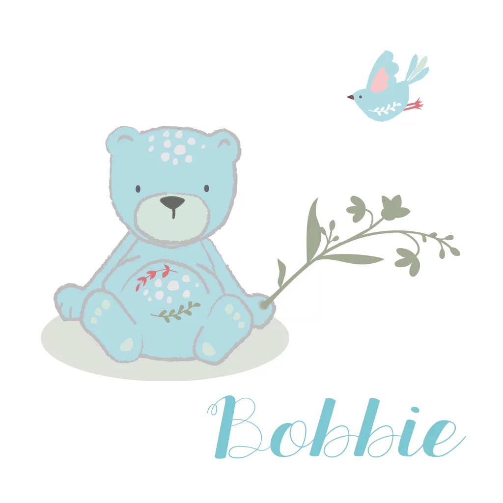 Lief geboortekaartje met zittend beertje en vogeltje en takjes