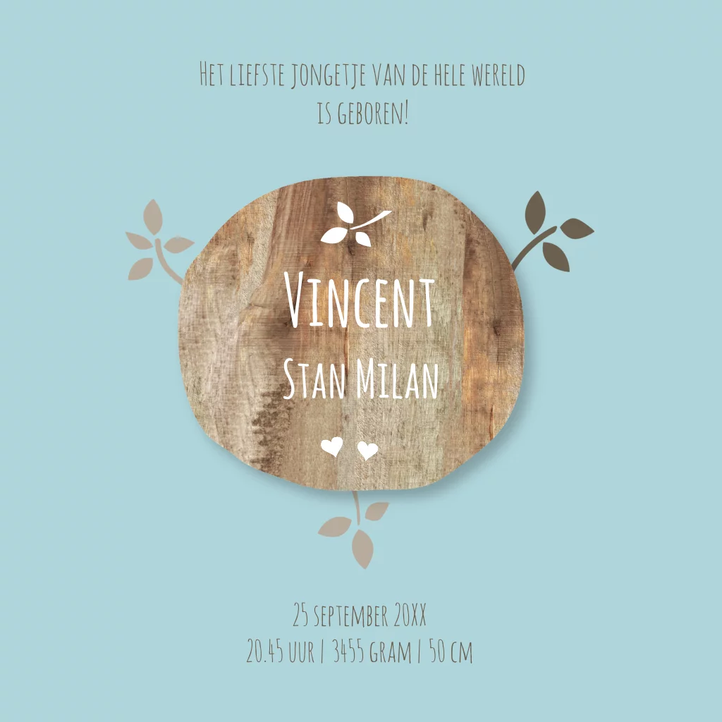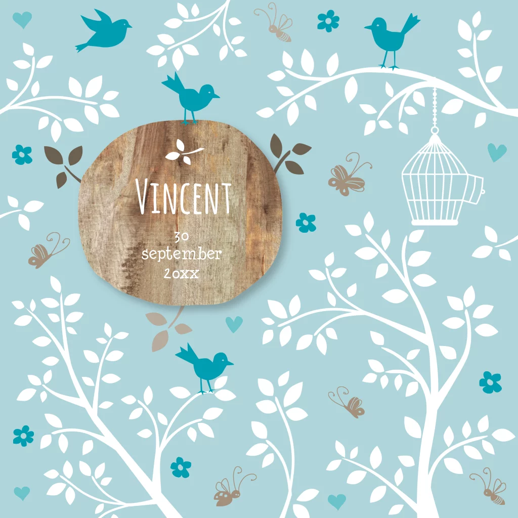 Origineel geboortekaartje Vincent voor lief baby jongetje met vogeltjes en bomen, takken en blaadjes in silhouet. Een mooi populair geboortekaartje om zelf te maken. Lief jongenskaartje met vogeltjes en vogelkooi op takjes en blaadjes. Ook voor babynamen kun je terecht bij JilleJille.nl
