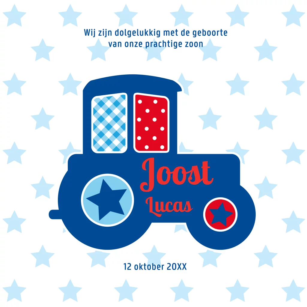 Hip geboortekaartje met sterren dessin en vrolijke hippe tractor voor jongen. Origineel kaartje voor je pasgeboren zoontje met trendy tractor en leuke sterren. Trendy geboortekaartje met tractor zelf maken bij JilleJille.nl