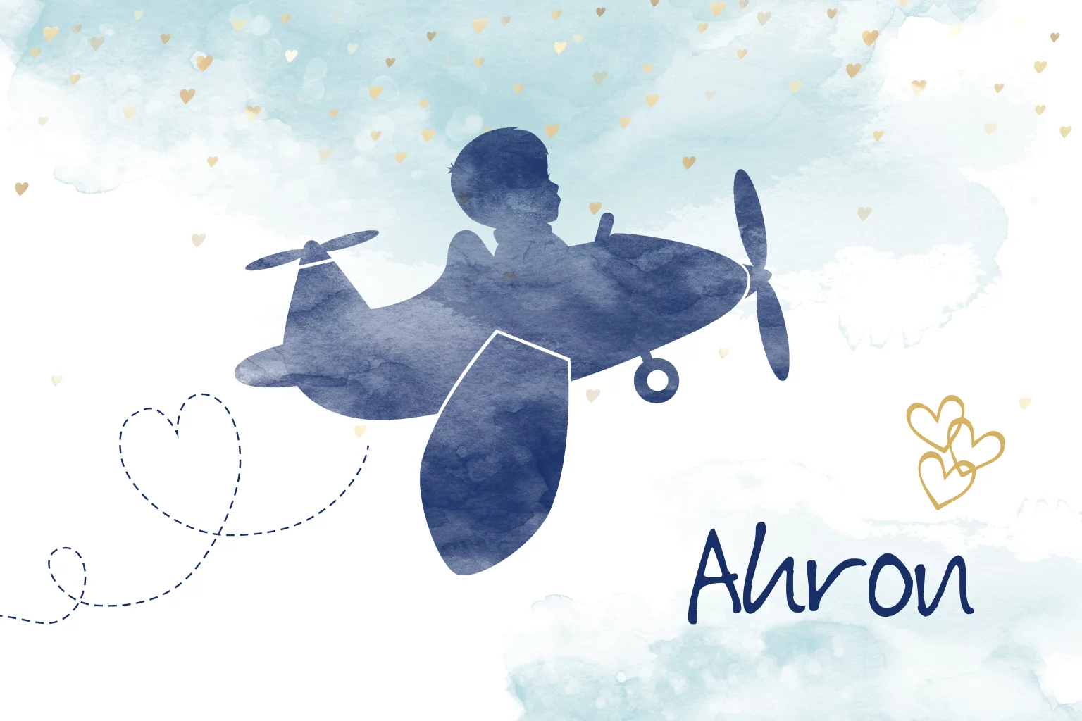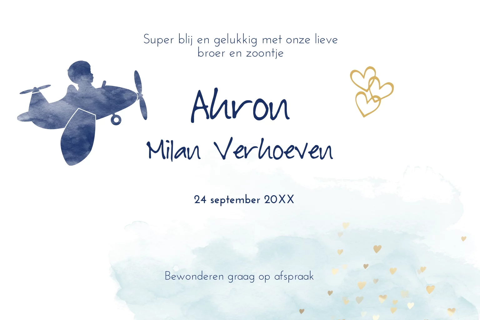 Hip geboortekaartje met een waterverf vliegtuigje voor een jongetje en goudkleurige confetti van hartjes.