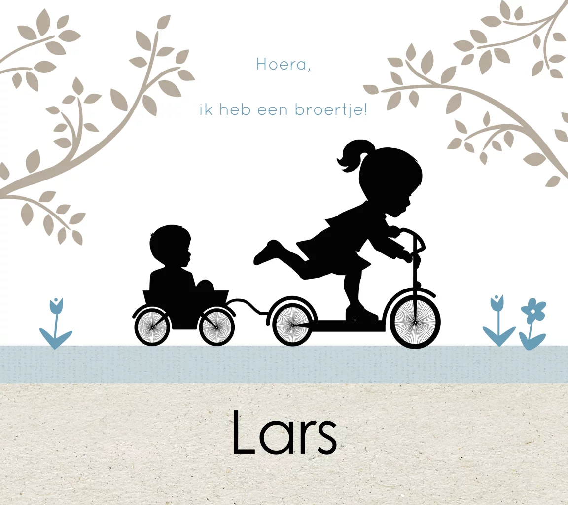 Lief en stijlvol geboortekaartje voor jongetje met grote zus op de step in silhouet, met kraft papier op de achtergrond.