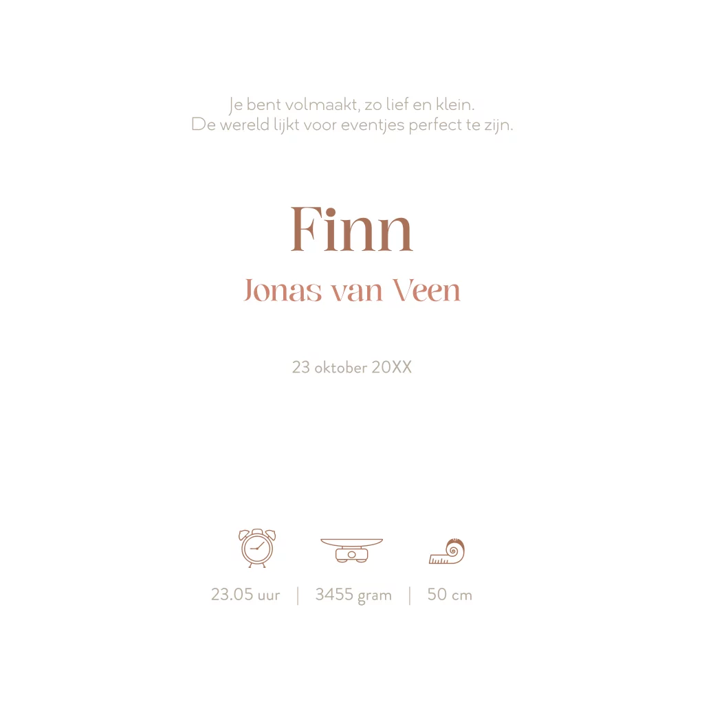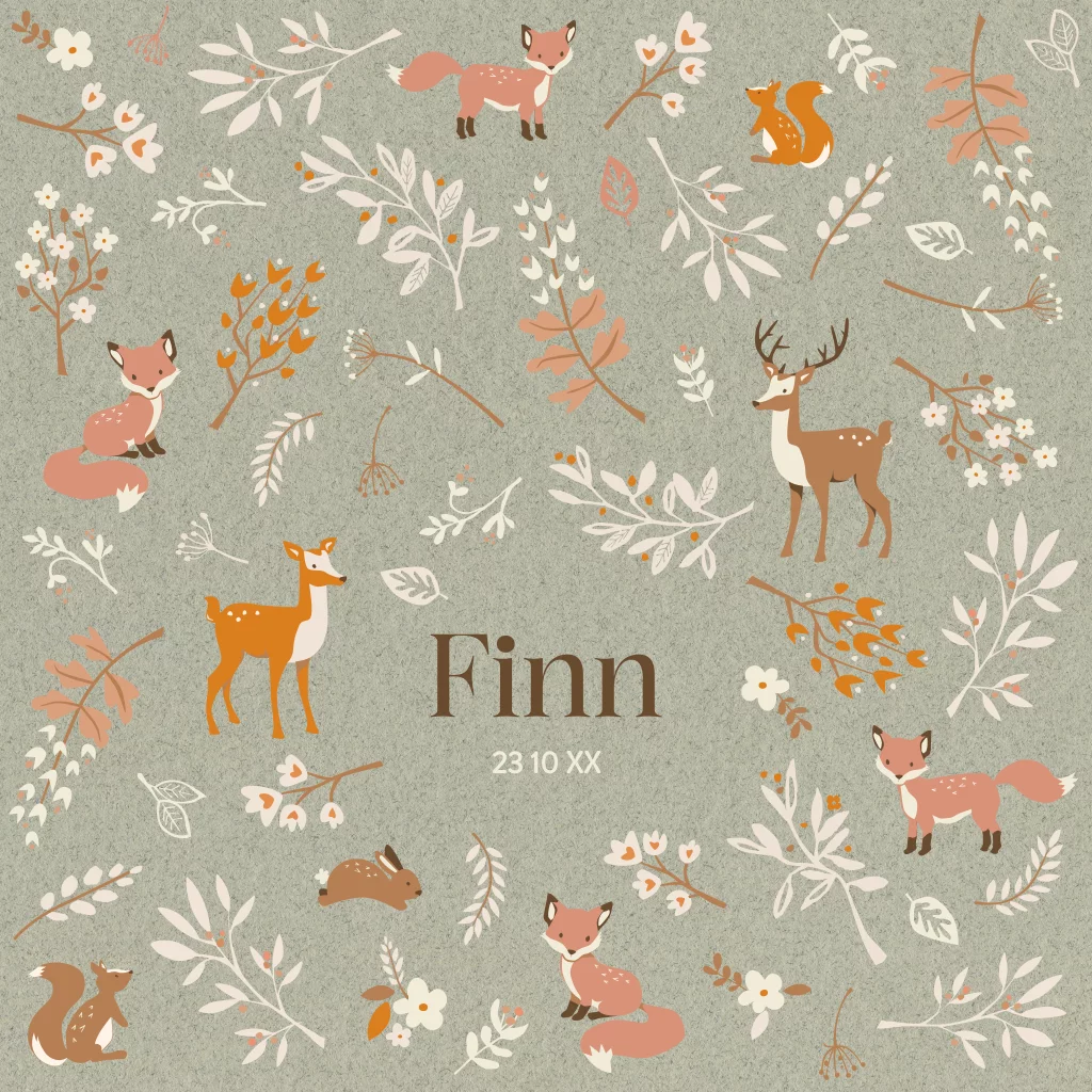 Een schattig unisex geboortekaartje met illustraties van bosdieren zoals een hertje, een vosje, een konijn en een eekhoorn te midden van blaadjes en takjes.