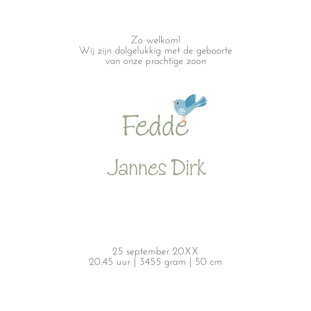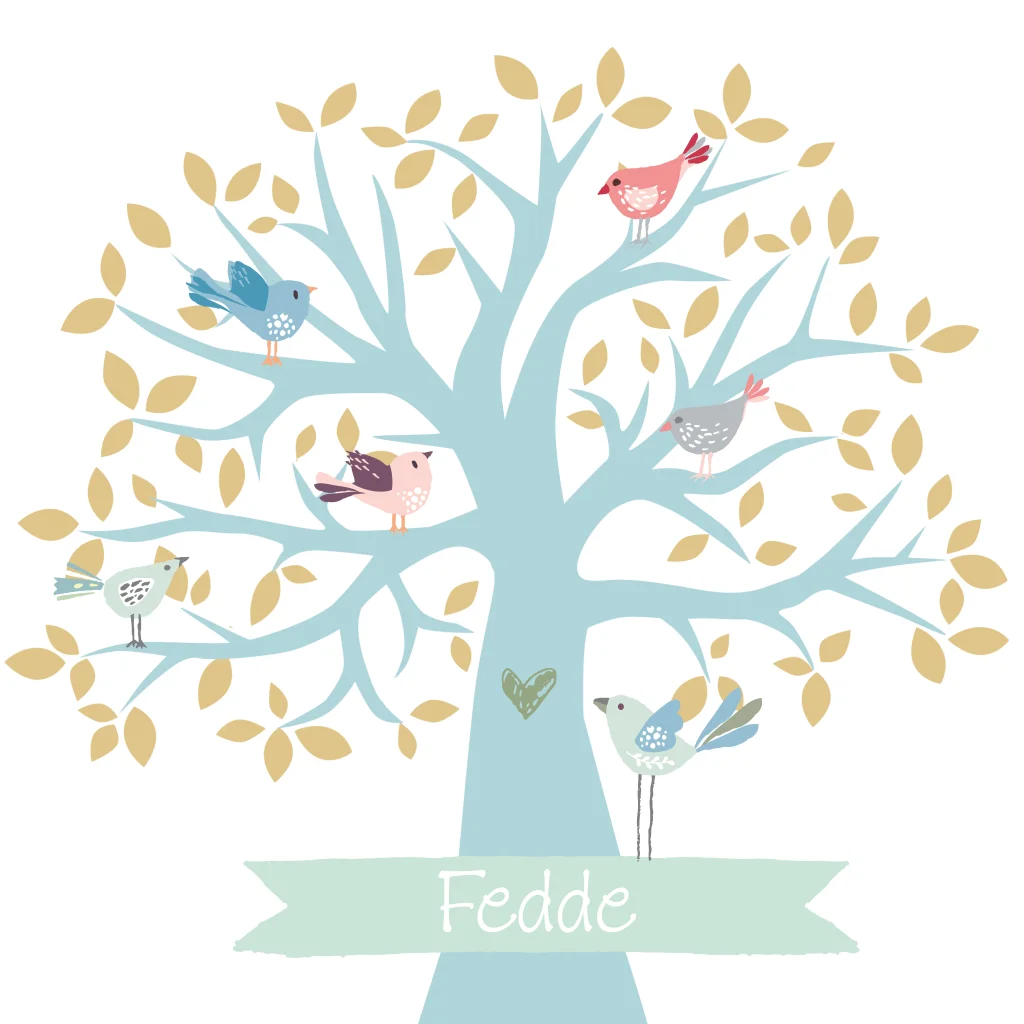 Vrolijke geboortekaart Fedde met boom blaadjes en leuke vogeltjes