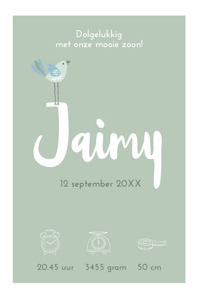 Mooie enkele geboortekaart met lief vogeltje. Hip kaartje om zelf aan te passen.