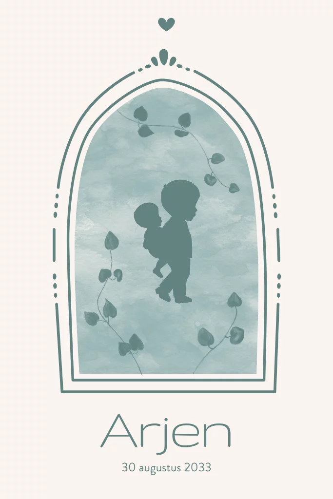 Mooie staande geboortekaart met een silhouet van een jongetje met zijn kleine broertje op de rug in een mooi kader. Deze kaart kun je helemaal zelf bewerken en aanpassen naar jouw eigen gezinssituatie.