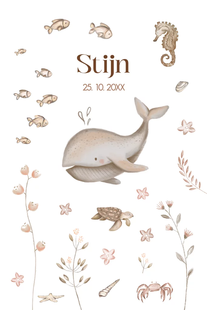 Een geboortekaart onderwater dieren als een walvis krabbetje en zeepaard en visjes. Dit unisex geboortekaartje kunnen we ook in een ander formaat aanpassen neem daarvoor even contact met ons op.