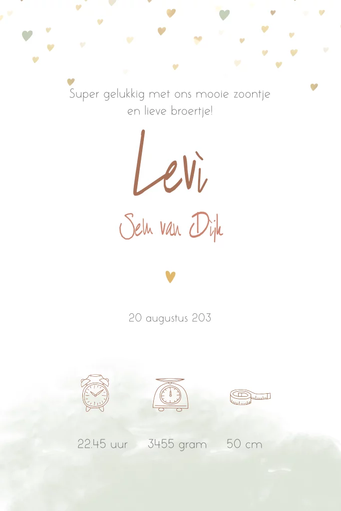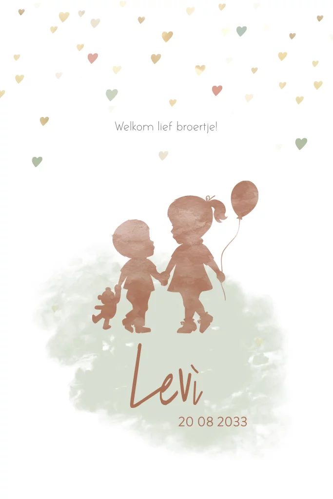 Hippe geboortekaart voor een jongen met broertjes hand in hand en met hartjes confetti. De kleuren zijn hier roest en groen maar deze kun je eenvoudig zelf aanpassen evenals de afbeeldingen, ook voor zusjes en broertje en zusje. Dit kaartje heeft afgeronde hoeken. Liever een ander formaat of een andere afbeelding, vraag het ons gerust!