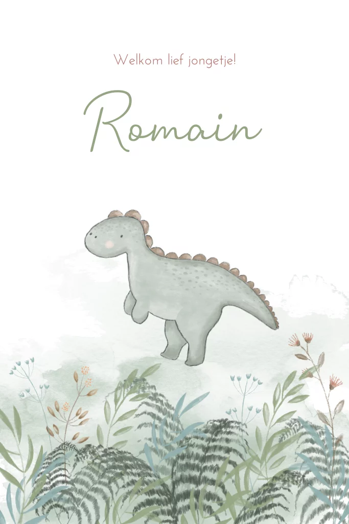 Lief geboortekaartje met een dino / draakje in waterverf en veldbloemen en varens. Verander zelf eenvoudig de kleuren of pas de afbeelding aan voor meerdere dino's voor nog een ouder broertje of zusje.