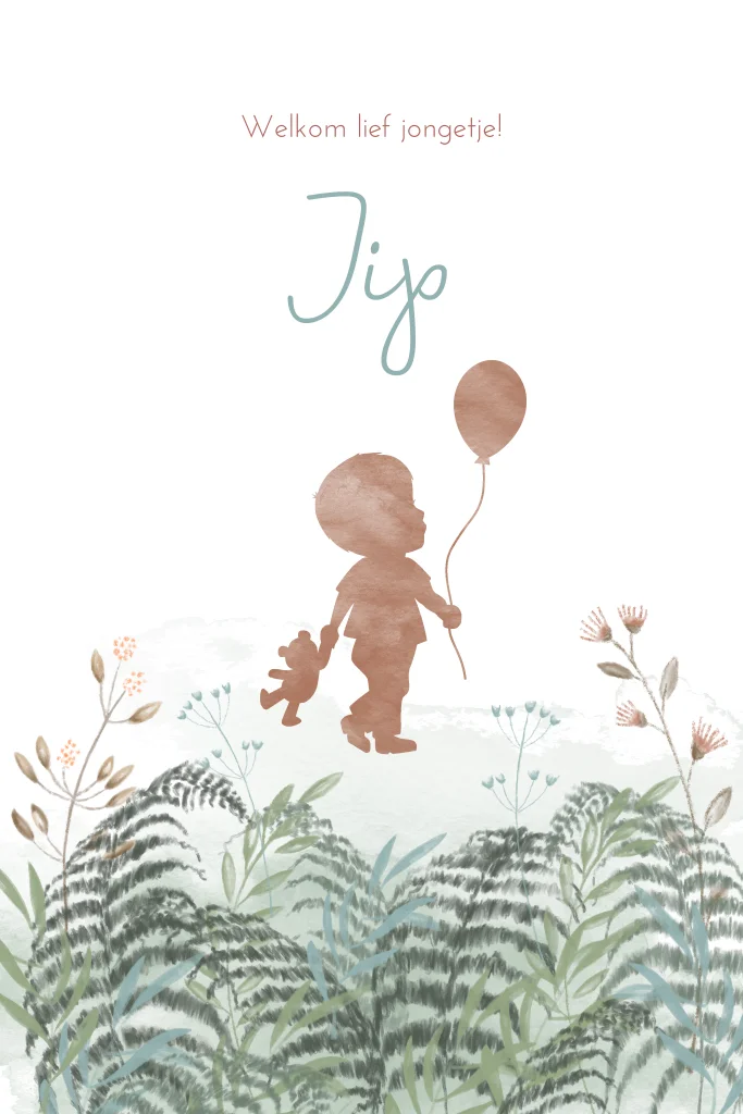 Lief geboortekaartje met waterverf silhouette en veldbloemen en varens voor een jongen. Verander zelf eenvoudig de kleuren of pas de afbeelding aan voor nog een ouder broertje of zusje.