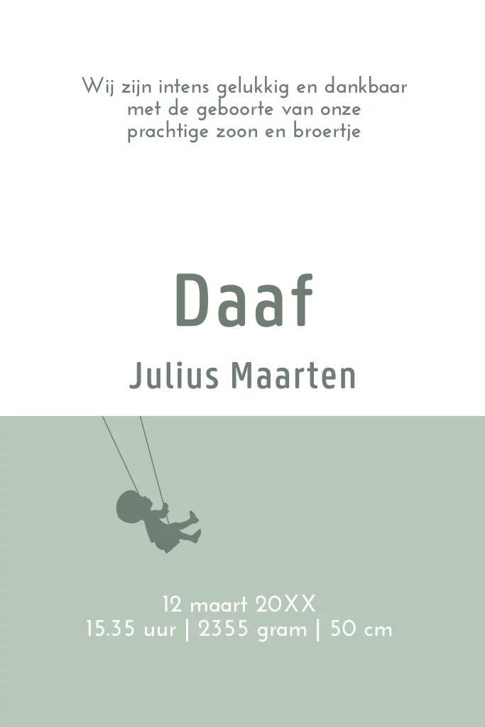 Trendy geboortekaart met silhouet van jongetje op een hobbelpaard. Hip kaartje om zelf aan te passen.