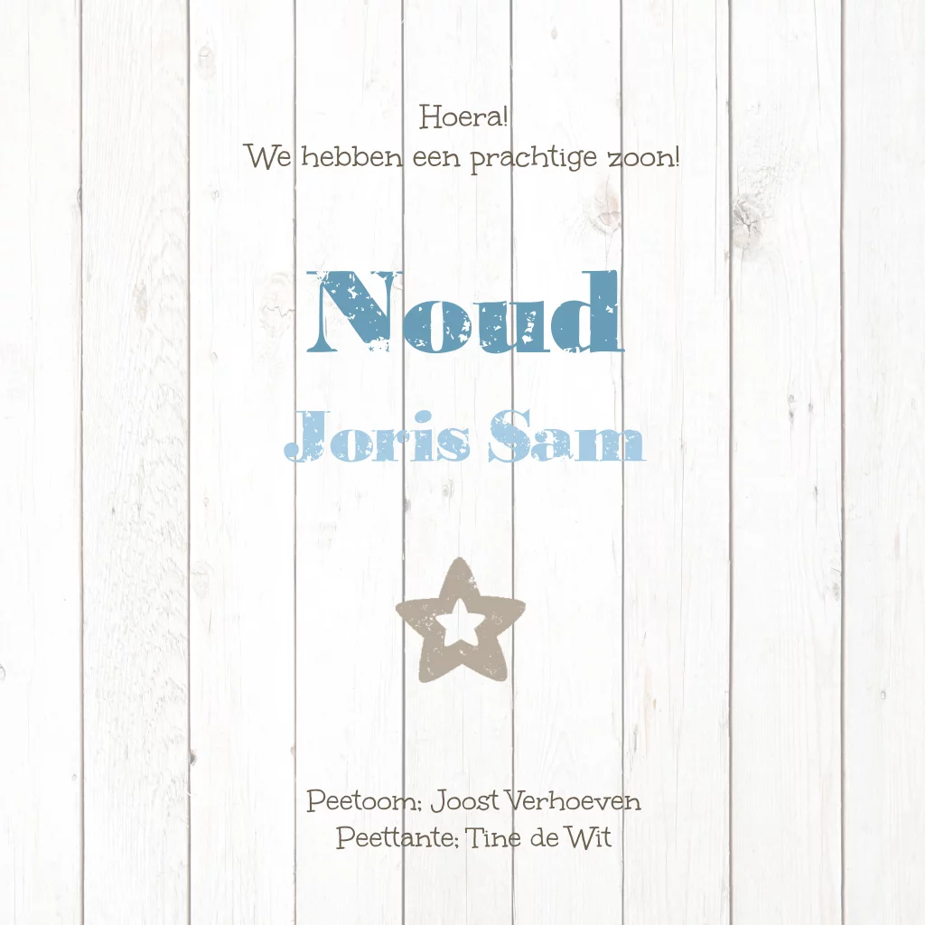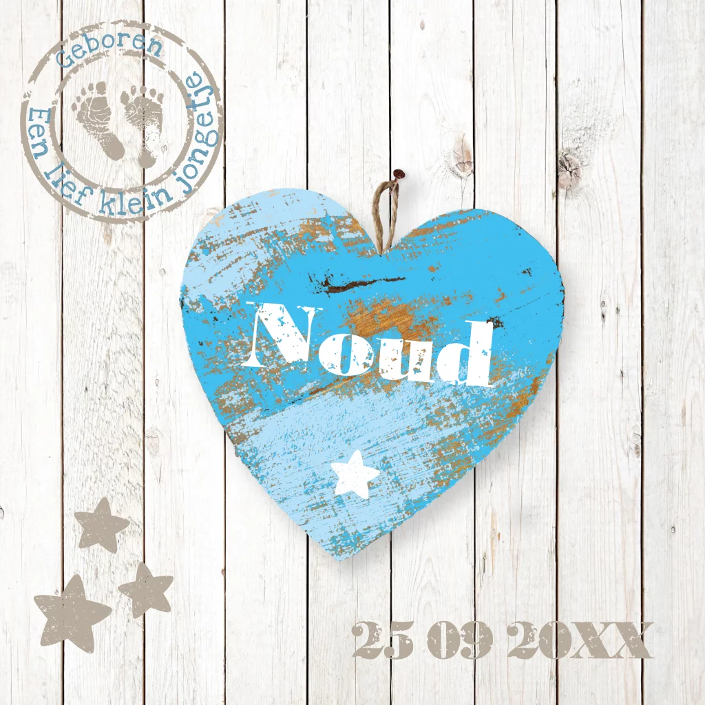 Trendy, stoer geboortekaartje met steigerhout en hippe stempels voor jongen. Op de voorkant een blauw geverfd houten hart met de naam.
