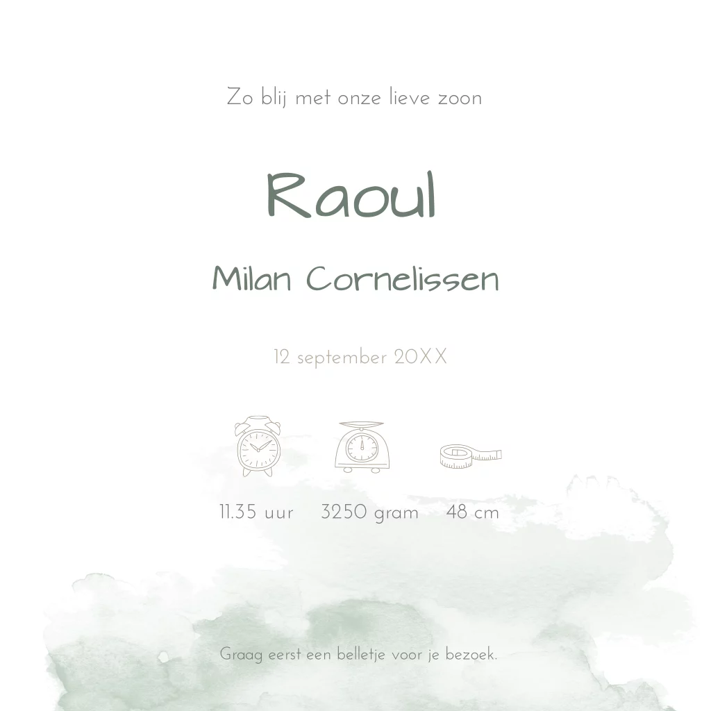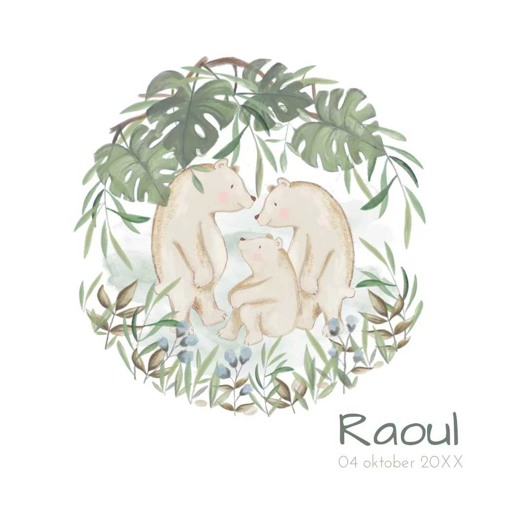 Avontuurlijk geboortekaartje voor een jongetje met een lief handgetekend waterverf beertje in de jungle met bladeren en bloemen.