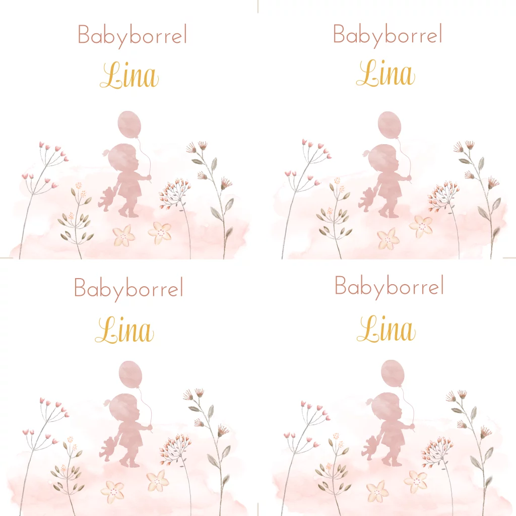 Lief doopsuiker kaartje met silhouet van meisje in waterverf met illustraties van veldbloemen ( 4x op kaart van 11, 13 of 15 cm) Deze kaartjes moet je zelf los snijden.