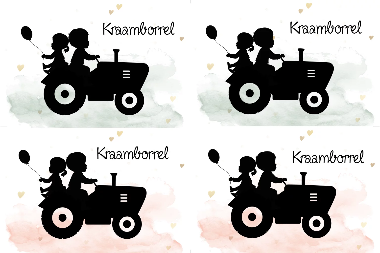 Kraamfeest unisex uitnodiging met silhouet van kindjes op een tractor. Personaliseer dit kaartje door de afbeelding te vervangen of de kleuren aan te passen.
