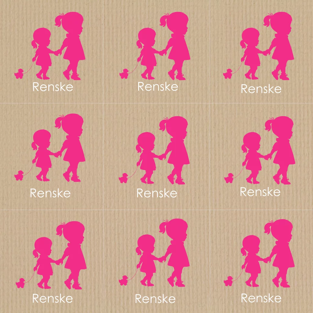 Modern design doopsuikerkaartje met silhouet van twee zusjes hand in hand. ( 9x op 1 kaart van 15 cm) zelf los snijden!
