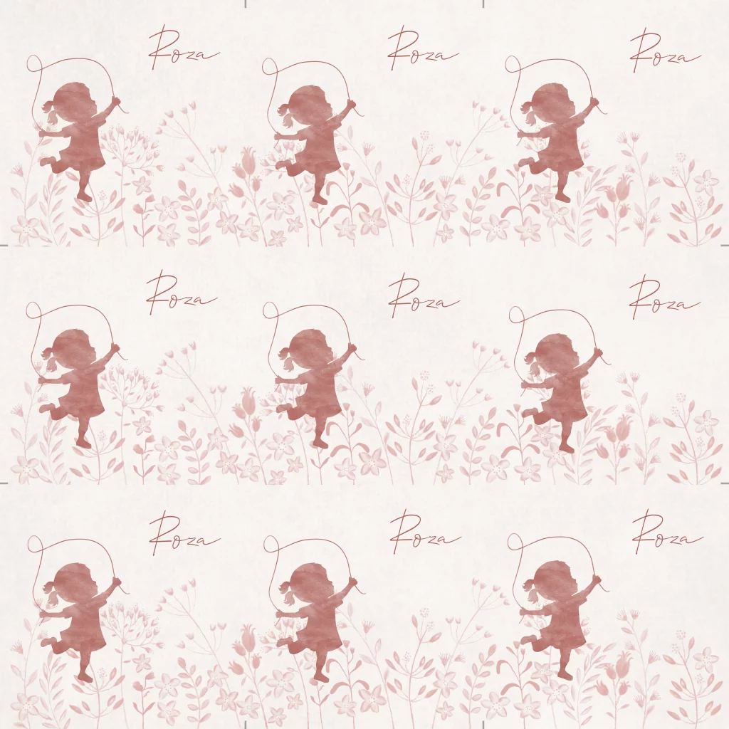 Een kaartje voor het kraamfeest met het silhouet van een meisje met een springtouw temidden van een veld met bloemen. De tekst op de achterkant kun je zelf schrijven, deze kaart moet je zelf uitsnijden zodat je 9 kaartje hebt. Bestel 15 x 15 cm voor kaartjes van 5 x 5 cm