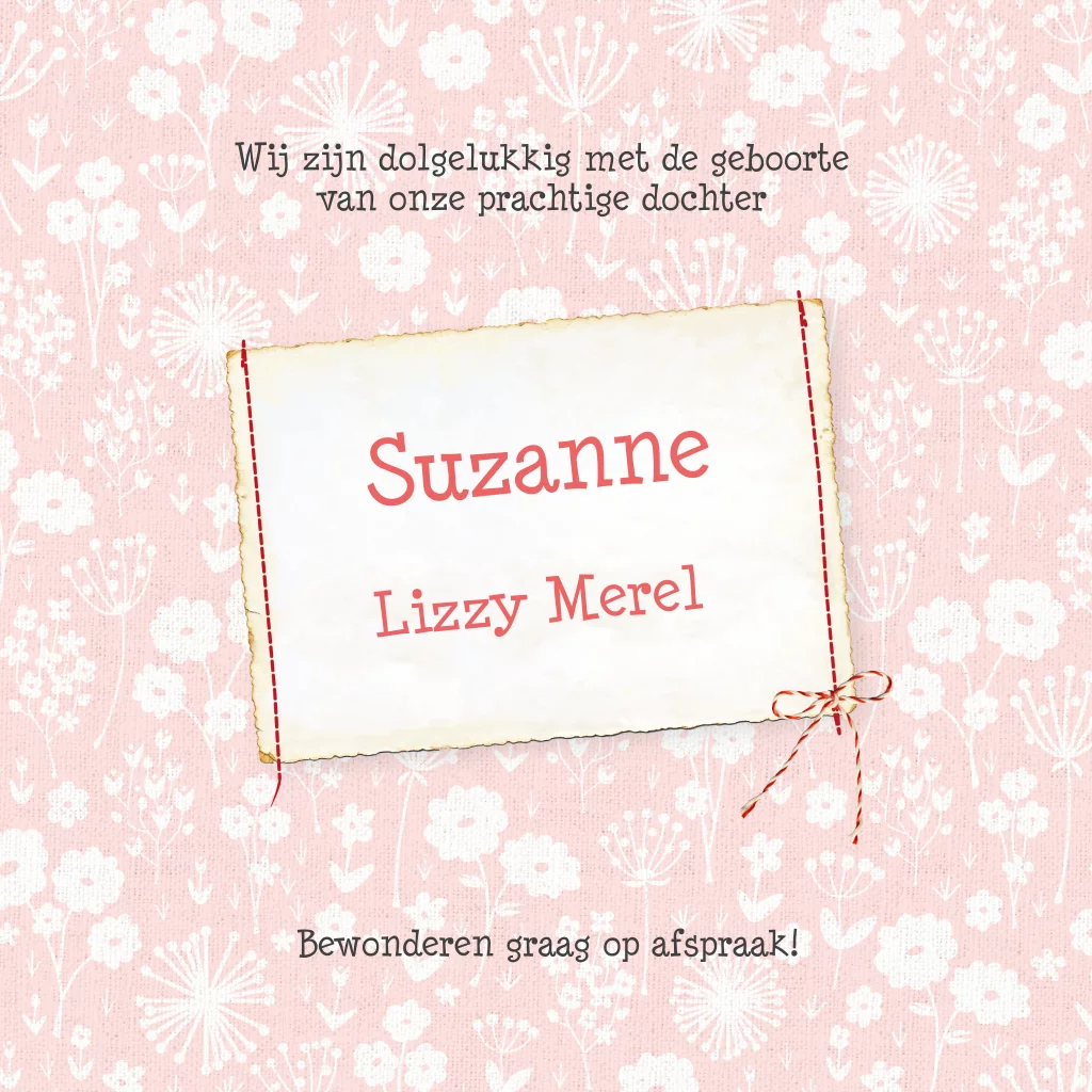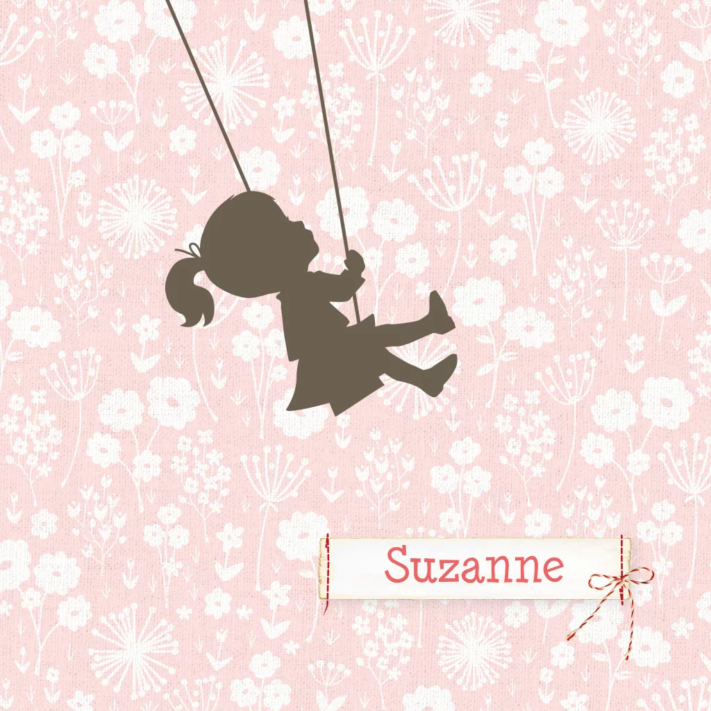 Vintage geboortekaartje met bloemen dessin voor lief meisje. Silhouet meisje met schommel op linnen structuur achtergrond.