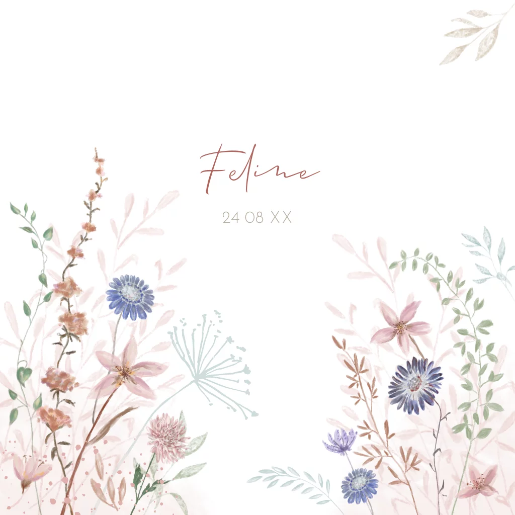 Mooie huwelijks uitnodiging met illustraties van diverse gekleurde veldbloemen die voor een stijlvolle uitstraling zorgen. Deze kaart kun je eenvoudig zelf bewerken.