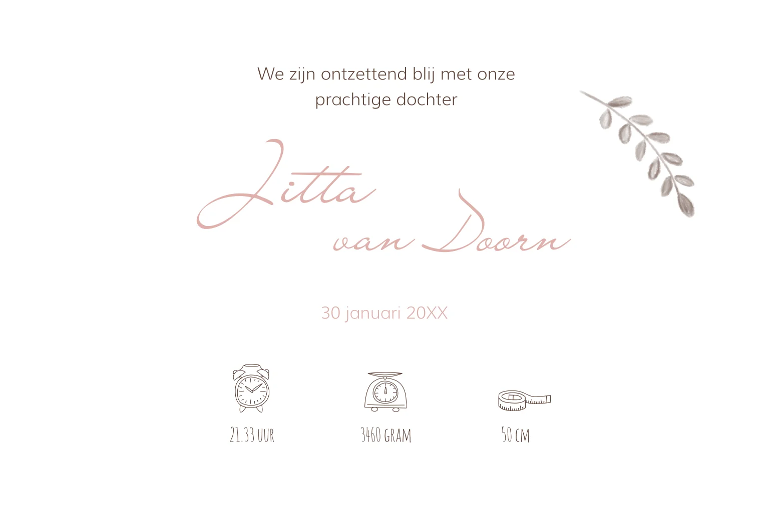 Plaats de mooiste foto van je kindje in dit schattige geboortekaartje met icoontjes en een takje aan de binnenzijde.