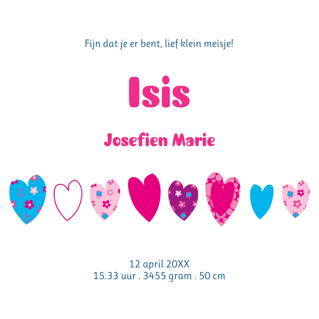 Dit vrolijke hippe geboortekaartje Isis met gezellige hartjes en bloemetjes dessins is voor het liefste meisje van de wereld. Een origineel geboortekaartje vol liefde.