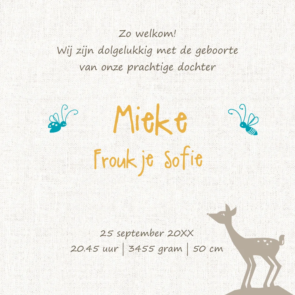 Geboortekaartje met lief hertje en retro eekhoorn onder een boom met vlindertje, lieveheersbeestje en bijtje en veel bloemetjes. Dit kaartje Lieke op een linnen achtergrond kun je zelf maken.