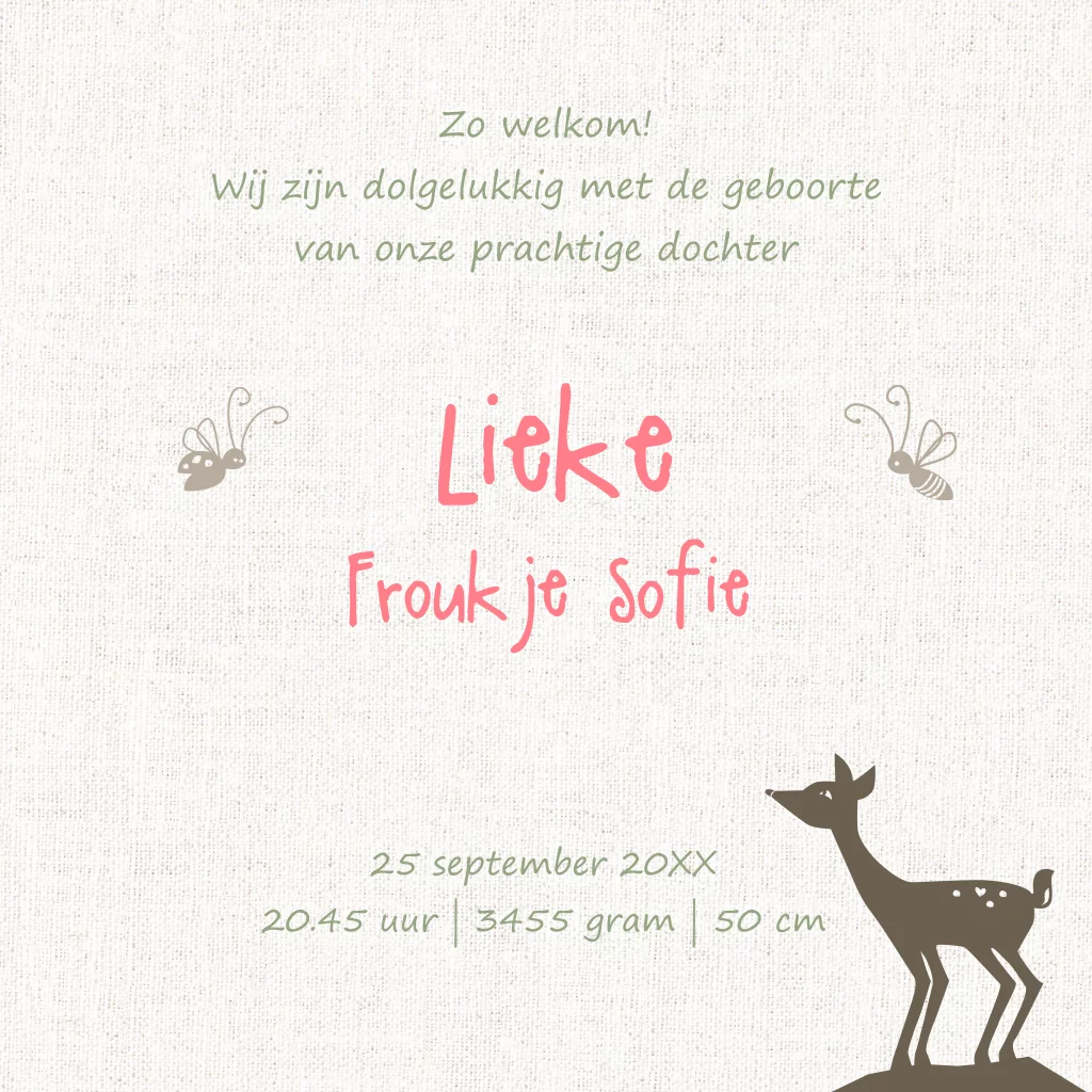 Geboortekaartje met lief hertje en retro eekhoorn onder een boom met vlindertje, lieveheersbeestje en bijtje en veel bloemetjes. Dit kaartje Lieke op een linnen achtergrond kun je zelf maken.