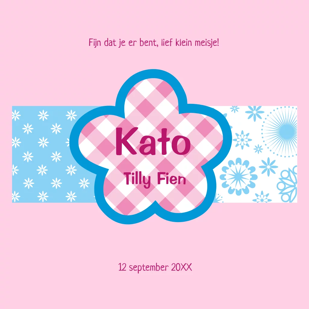 Dit vrolijke geboortekaartje in roze-wit en blauw met geruite bloem met naam is voor een lief meisje bedoeld. Klik op 'maak deze kaart' om te starten. Nu kun je zelf eenvoudig je geboortekaartje met klavertjes maken of aanpassen. Gewicht, tijdstip van geboorte en de lengte kun je aan de binnenzijde invullen.