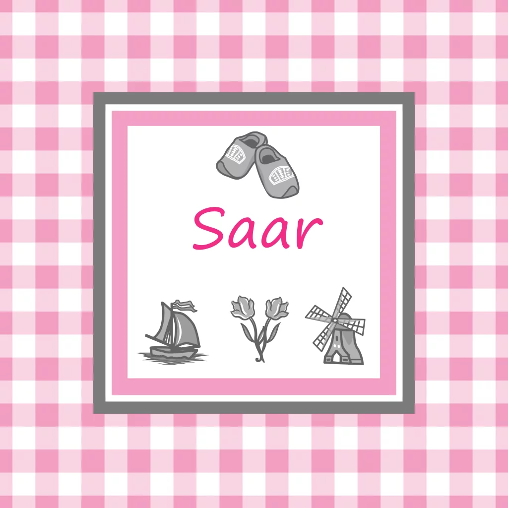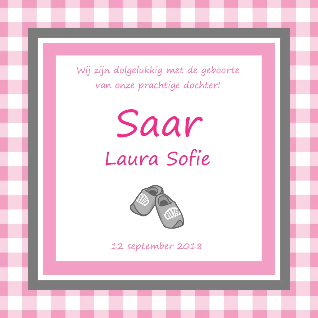 Trendy Hollandse geboortekaarten met ruitje en leuke tulpen een schattig bootje een molen en klompjes. Geboortekaartje Saar met ruitjes en hollandse thema's om zelf te maken. Een leuke hollandse kaart voor een hip meisje in een bijzondere kleurcombinatie van roze en grijze tinten.