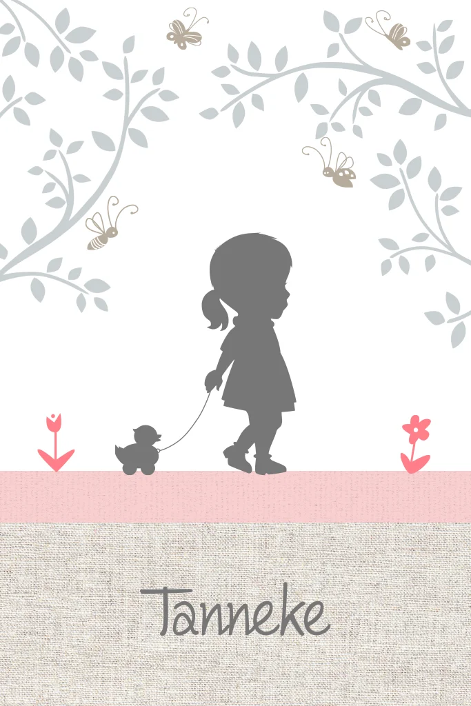 Hip geboortekaartje met silhouet van meisje met linnen structuur