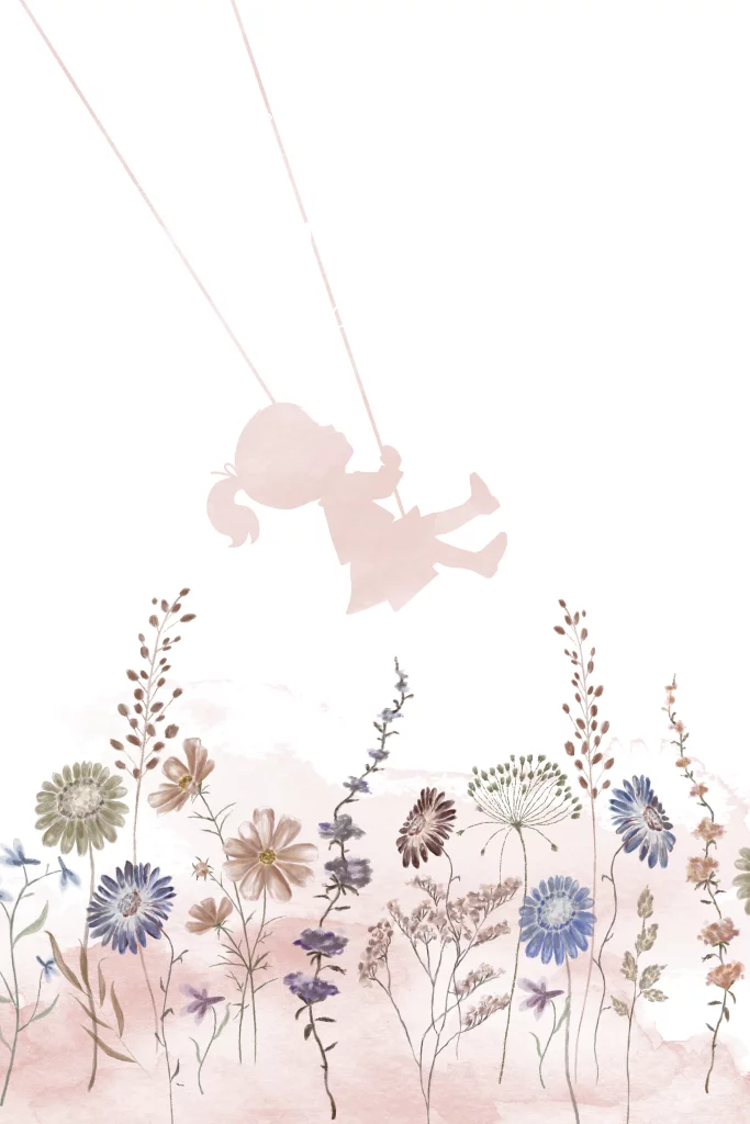 Een enkele meisjeskaart met een waterverf silhouet van een meisje op een schommel en kleine geschilderde bloemetjes. Deze kaart kun je eenvoudig zelf aanpassen.