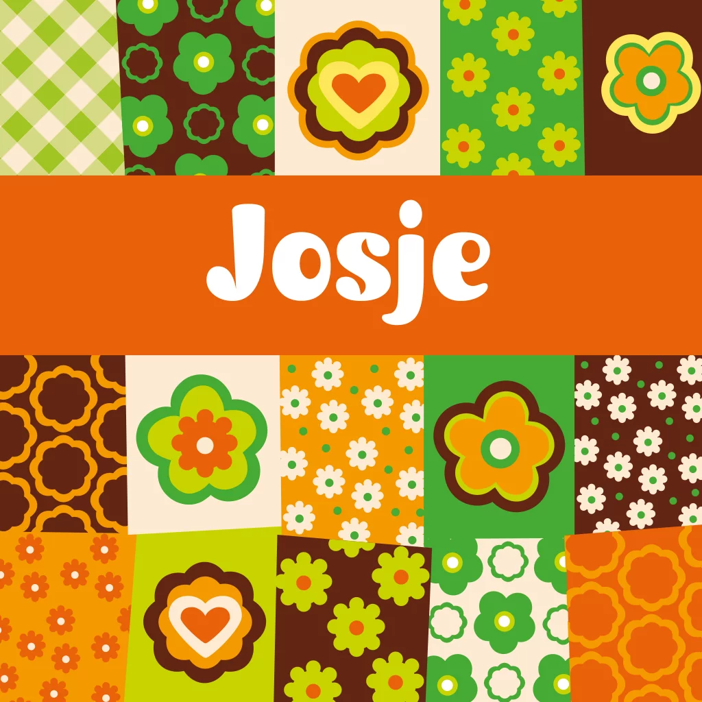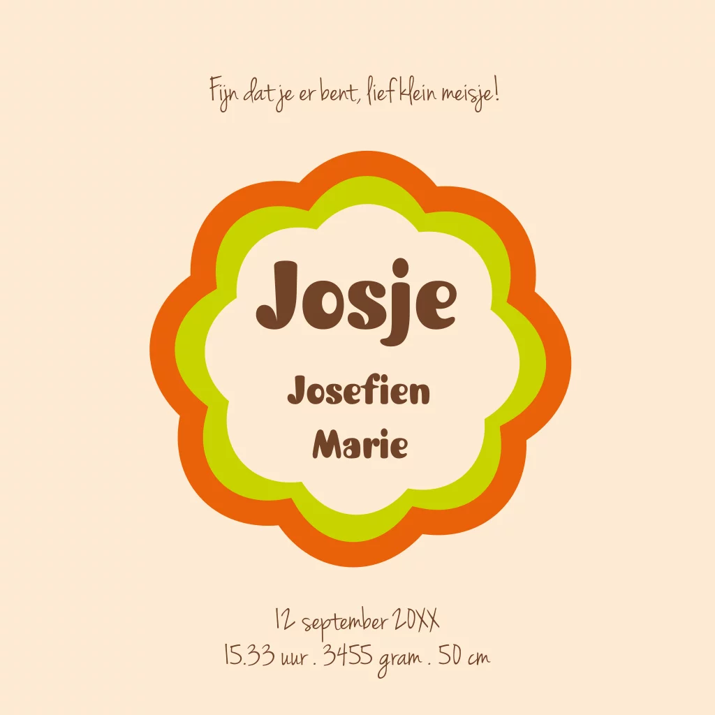Dit vrolijke vintage geboortekaartje Josje met gezellige hartjes en bloemetjes dessins is voor het liefste meisje van de wereld. Een origineel geboortekaartje vol gezelligheid in retro kleuren.
